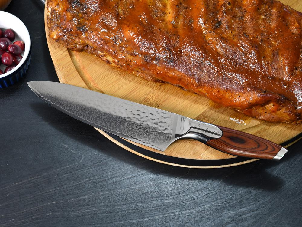 - Made from Japanese VG10 steel layer underneath 67 layers of Damascus steel